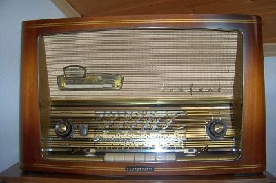 Hier sehen Sie einen Tonfunk "Zauberperle" aus dem Jahr 1956-57. Dieses Gerät konnte man mit einer Ultraschall-Fernbedienung Ein und Aus schalten. Es hat 4 Lautsprecher und damit einen super Klang!